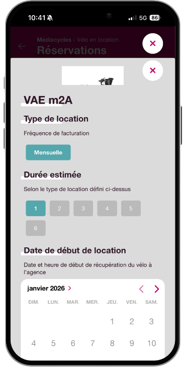 Choisis la durée, la date de début de location, et le créneau de ton rendez-vous (la date de début de location correspond à la date de votre rendez-vous en agence Médiacycles) puis cliquez sur [Valider].